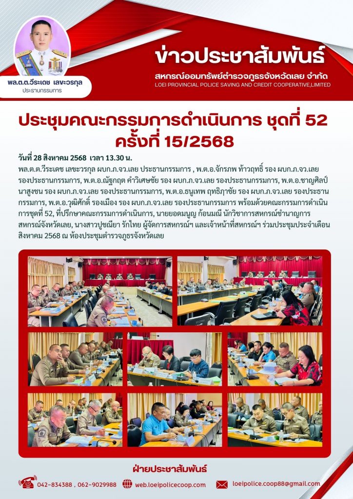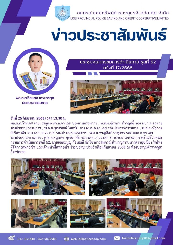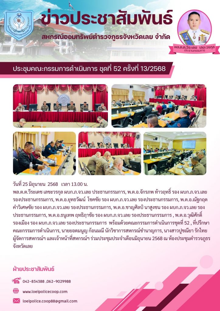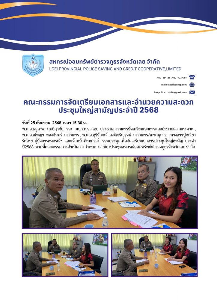 🔺โดยมีพ.ต.อ.จักรภพ ท้าวฤทธิ์ รอง ผบก.ภ.จว.เลย รองประธานปฎิบัติหน้าที่เป็นประธานกรรมการในที่ประชุม,พ.ต.อ.ธนาวัชร ดีบุญมี ณ ชุมแพ รอง ผบก.ภ.จว.เลย รองประธานกรรมการ,พ.ต.อ.ยุทธวัฒน์ โชคชัย,พ.ต.อ.ณัฐกฤต คำวิเศษชัย รอง ผบก.ภ.จว.เลย ที่ปรึกษาคณะกรรมการดำเนินการ,พ.ต.อ.ชาญศิลป์ นาสูงชน,พ.ต.อ.ธนูเทพ ฤทธิฦาชัย รอง ผบก.ภ.จว.เลย พร้อมด้วยคณะกรรมการดำเนินการชุดที่51,ที่ปรึกษาสหกรณ์,หน่วยงานที่เข้าร่วมประชุม นางจงจิตต์ วันปรีดา นักวิชาการสหกรณ์ชำนาญการพิเศษ ผู้อำนวยการกลุ่มส่งเสริมสหกรณ์1,ส.ต.ต.หญิง มายุลี คำมะนาง นักวิชาการตรวจสอบบัญชีชำนาญการพิเศษ สำนักงานตรวจบัญชีสหกรณ์,ผู้แทนสมาชิกและเจ้าหน้าที่สหกรณ์